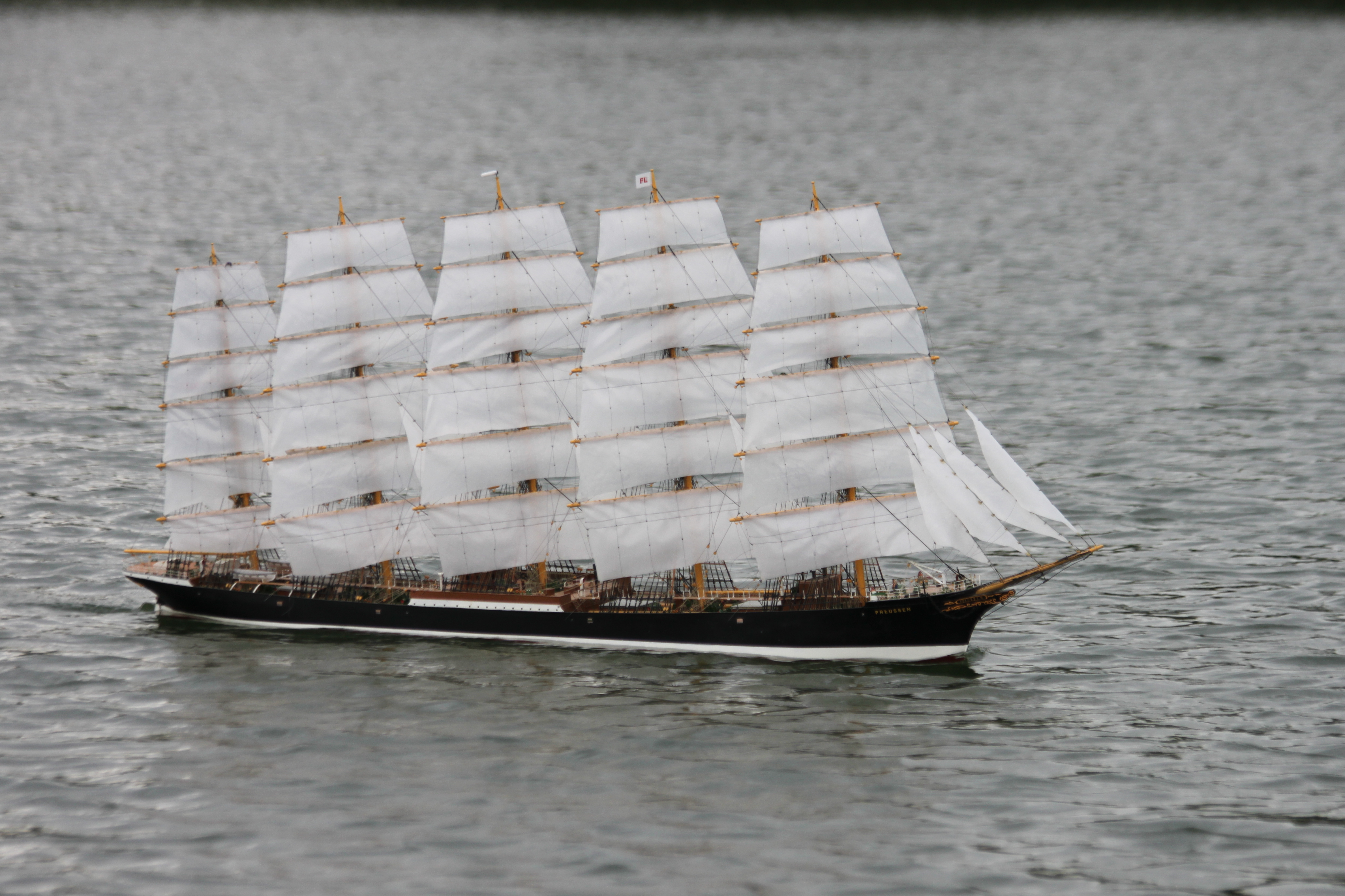 Die Preussen Die Preussen ist im Maßstab 1:75 gebaut, Die Preussen wurde gebaut um Salpeter aus Chile nach Hamburg zu holen. Salpeter wurde genutzt in der Landwirtschaft als Dünger, und für die Sprengstoffherstellung. Sie wurde 1902 in Gestemünde auf der Tecklenborgwerft gebaut, und segelt bis 1910 in der Salpeterfahrt. Im November 1910 auf der 14. Ausreise geriet die Preussen im Englischen Kanal in eine Kollision mit einem Postdampfer, und strandete in Folge der Kollision vor den Kreisfelsen nahe Dover. Das Modell hat keine Hilfsmaschine, eine Länge von 196cm; und Breite von 24 cm. Insgesammt sind über 40 laufende Seile auf Segelwinden geführt.
